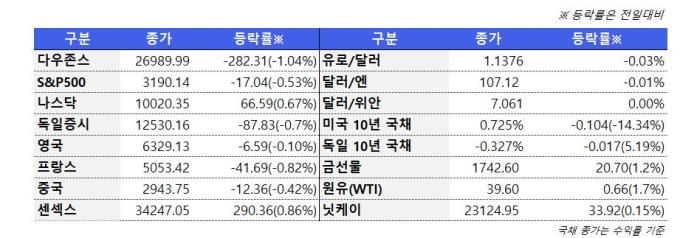 [뉴욕증시]1만선 돌파한 나스닥…유동성 기대감에도 다우·S&P ↓
